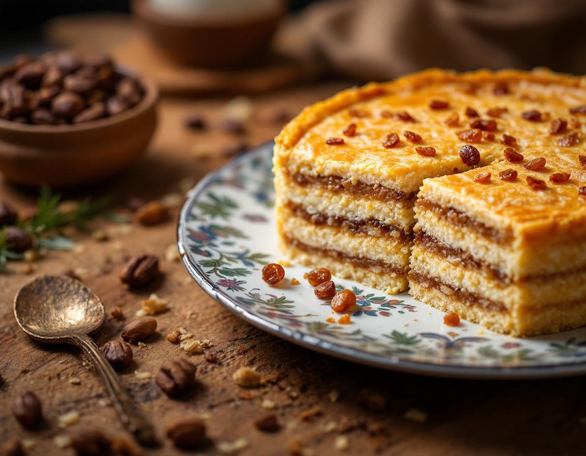 Многослойный татарский пирог с рисом, мясом, изюмом и корт (сушёный творог).